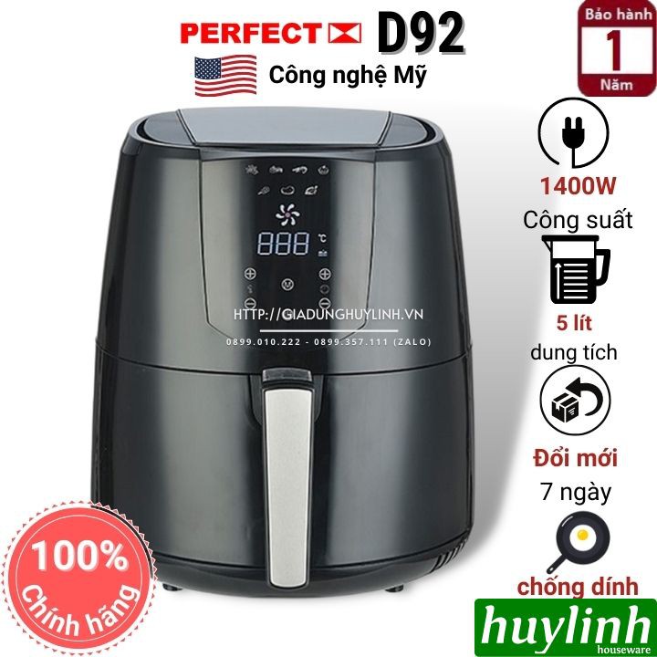 Nồi chiên không dầu Perfect D92 ra mắt năm 2020 với màu đen sang trọng, dung tích 5 lít, điều khiển điện tử, cảm ứng, với 7 chế độ cài sẵn rất hiện đại.Huy Linh phân phối và bảo hành chính hãng tại Perfect USA Việt Nam