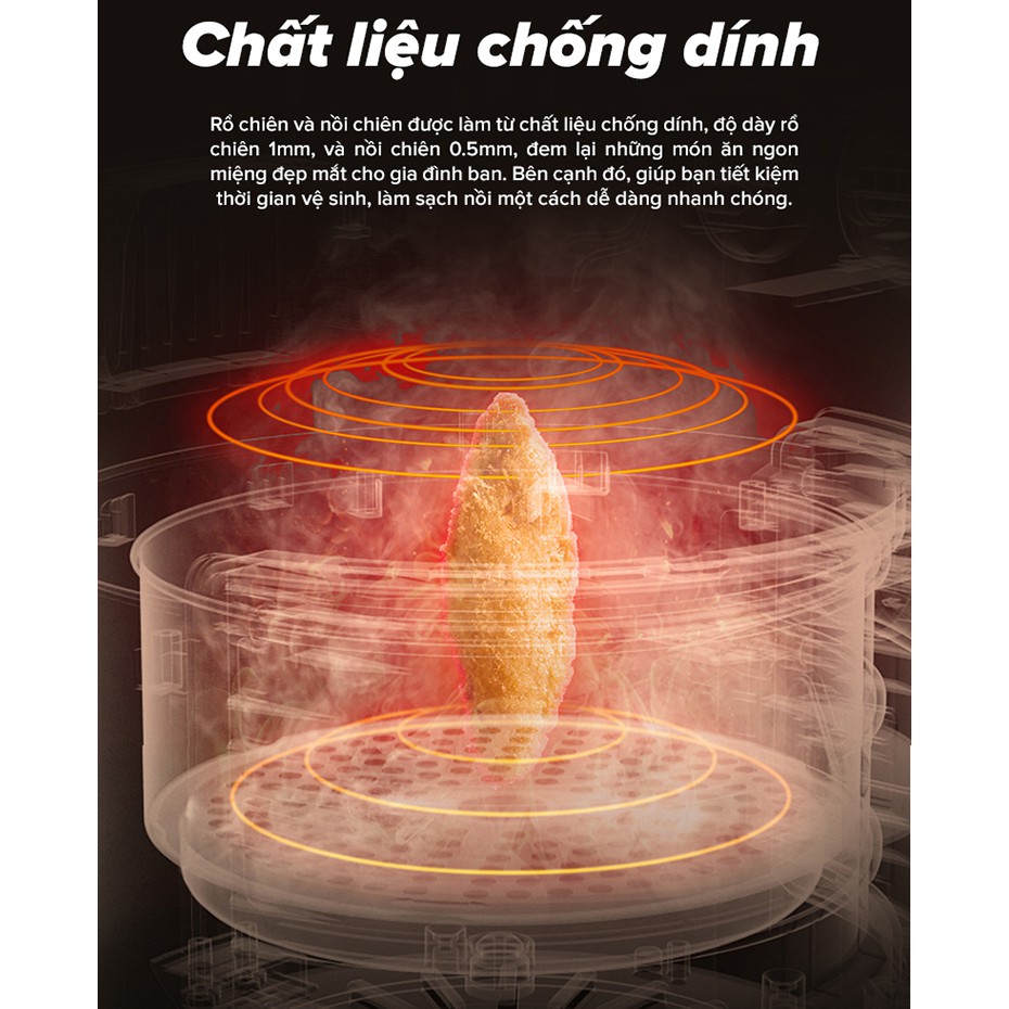 - Tiện ích kèm theo: Tự động ngắt khi quá nhiệt, Chân đế chống trượt, Rổ chiên có thể vệ sinh bằng máy rửa chén, không hoạt động khi không có nồi chiên, có miếng che nhựa che nút lấy rổ chiên, tự động tắt khi kéo nồi chiên ra, tư động bật khi gắn nồi chiên vào