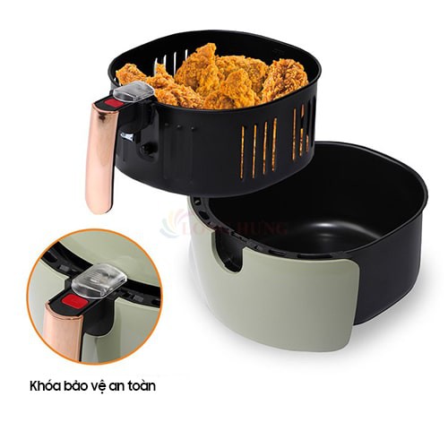 Nồi chiên Casamom sở hữu thiết kế lạ mắt, tông màu xanh ngọc bích phối vàng dễ dàng thu hút ánh nhìn ngay từ lần đâu tiên. Chất liệu nhựa ABS cứng cáp, giảm nóng và an toàn với người sử dụng, bề mặt điều khiển cơ được mạ màu vàng bắt mắt.