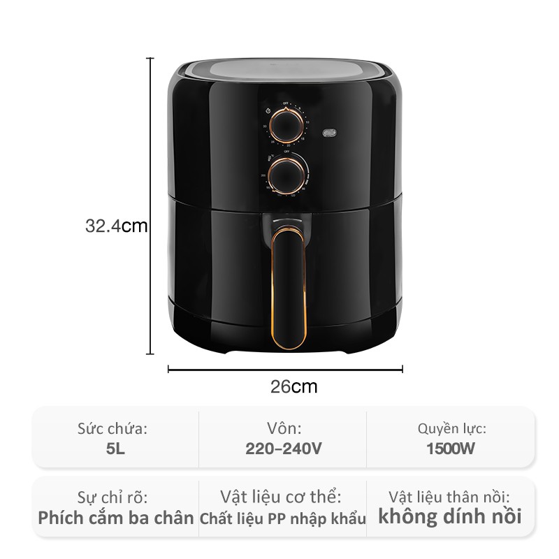Nồi chiên không dầu dung tích 5L mang nhiều chức năng thông minh như rán quay nướng không dùng dầu mỡ