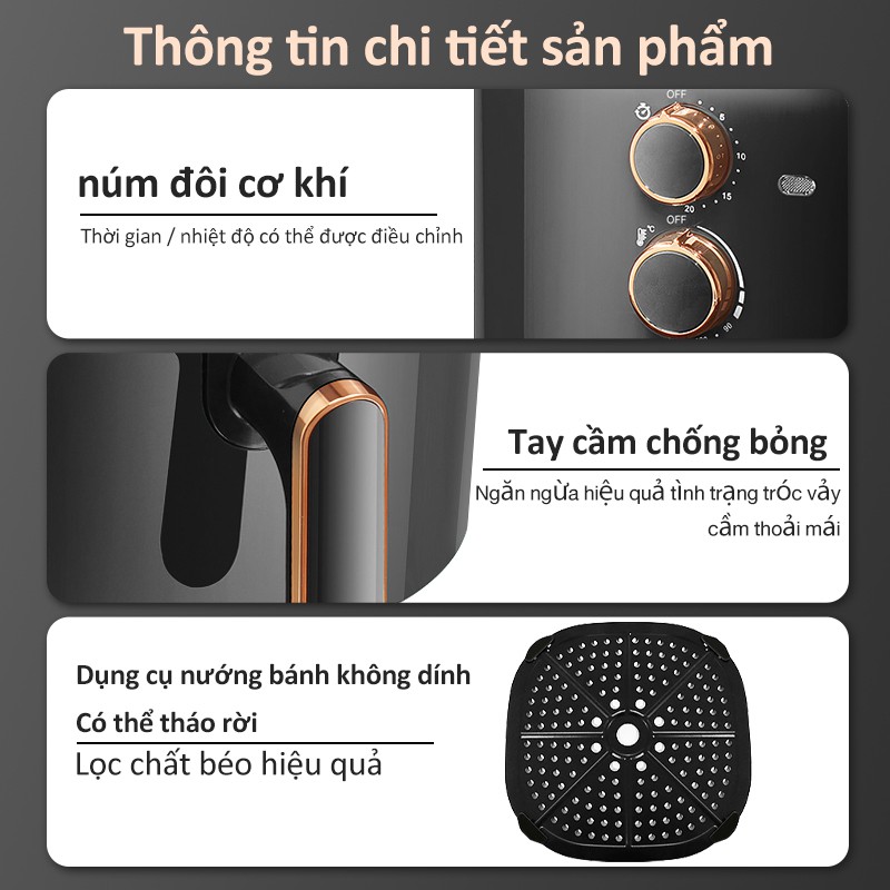 - Thiết kế độc đáo của nồi chiên kết hợp luồng khí được làm nóng 360 °, quạt turbo 8 cánh.