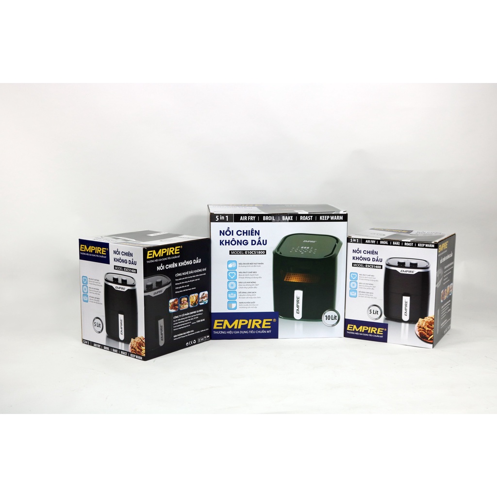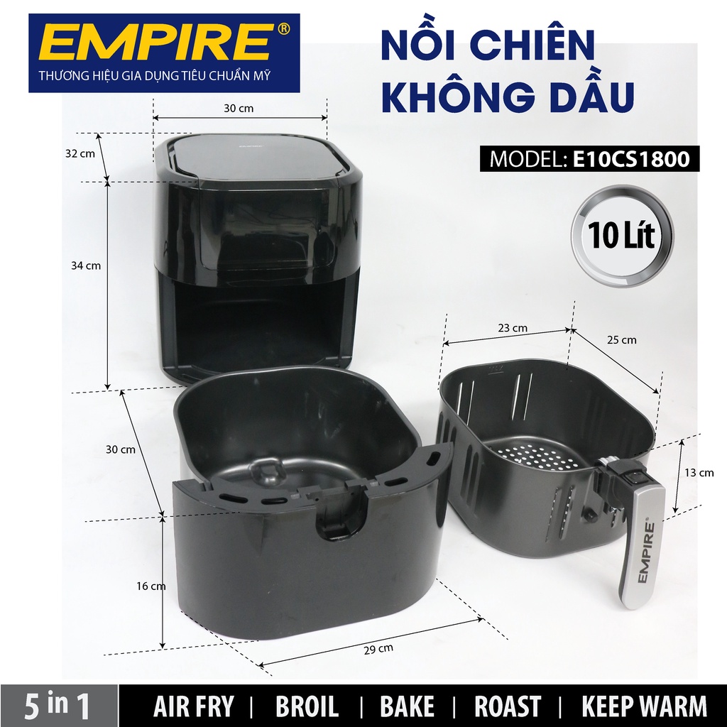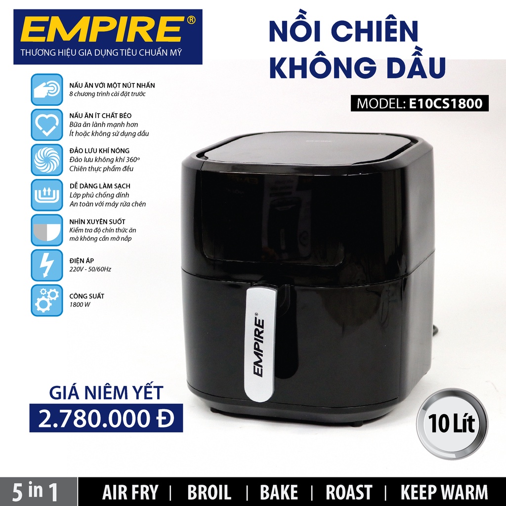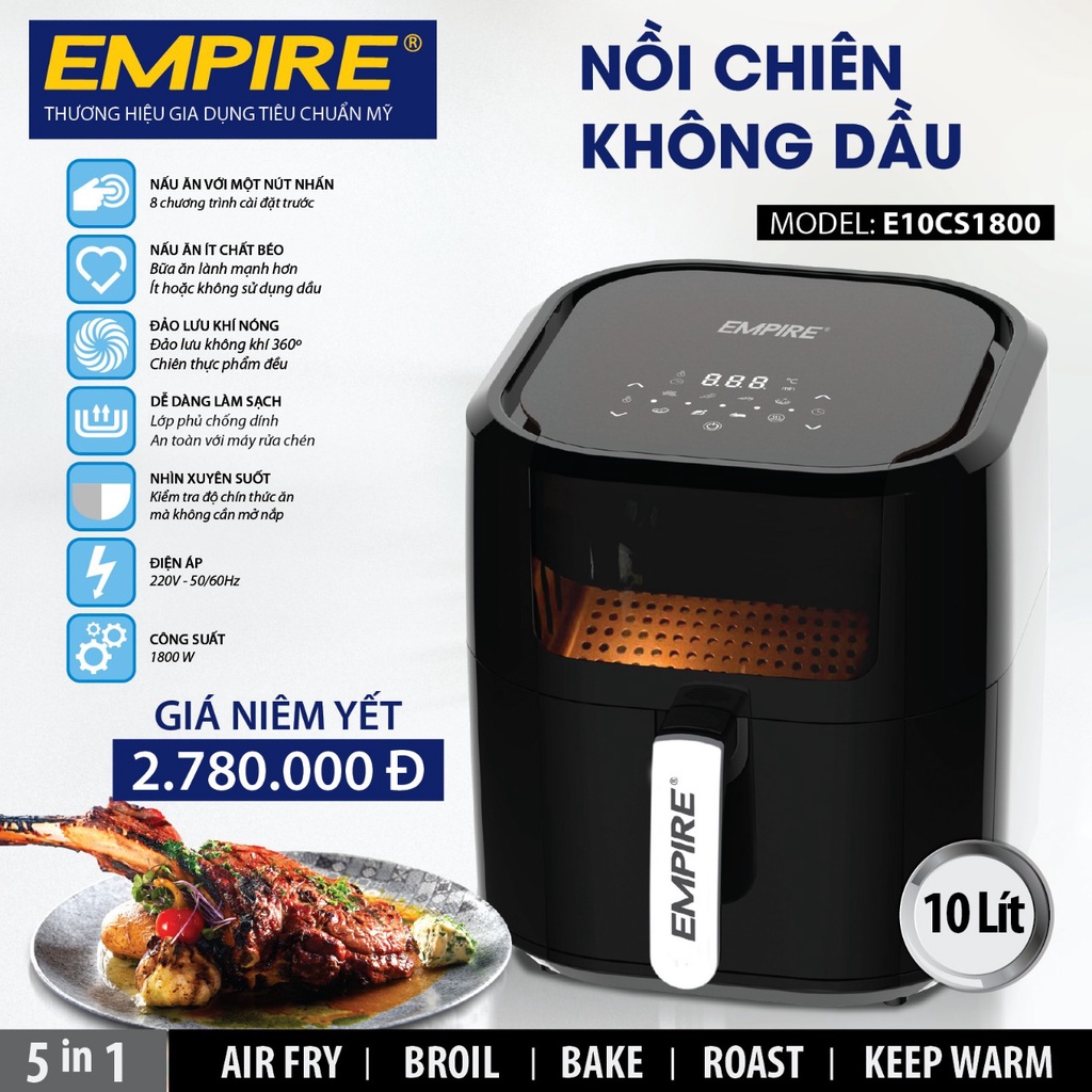 Nồi Chiên Không Dầu Empire dung tích 10L Công suất 1800W - bảo hành 12 thángTrong thời gian gần đây, nồi chiên không dầu ngày càng được ưa chuộng, bởi tính đa năng, dễ sử dụng, tiện ích. Với sự đa dạng từ nhãn hàng, model khác nhau, việc lựa chọn một nồi chiên không dầu phù hợp với nhu cầu sử dụng chưa bao giờ là điều dễ dàng. Vậy thì, tại sao nên chọn nồi chiên không dầu Empire có gì nổi bật để trở thành nồi chiên không dầu được yêu thích nhất?