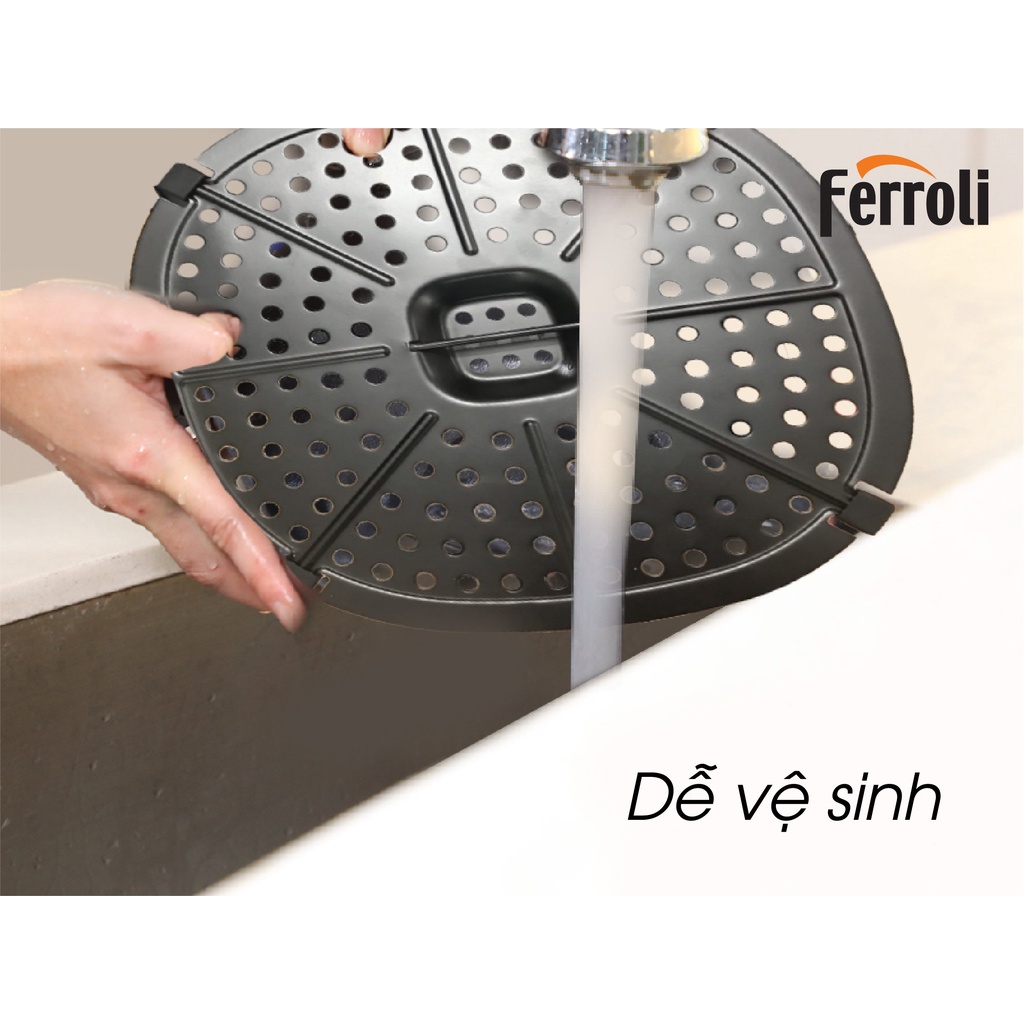 Một điểm nhấn khác cũng rất dễ nhận ra chính là thương hiệu Ferroli màu trắng ở mặt trên sản phẩm. Sự tương phản đen-trắng khiến dòng chữ Ferroli càng thêm nổi bật như một lời khẳng định của hãng về chất lượng chuẩn Italy vốn đặc biệt khắt khe với các sản phẩm đồ gia dụng nấu ăn.
