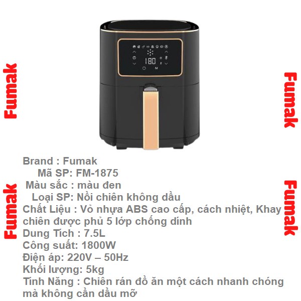 Giới thiệu Nồi chiên không dầu Fumak, Nồi chiên ko dầu Nhật Bản, Dung Tích 7.5L,Bảo hành 18 tháng đổi mới 30 ngày. FM-1875