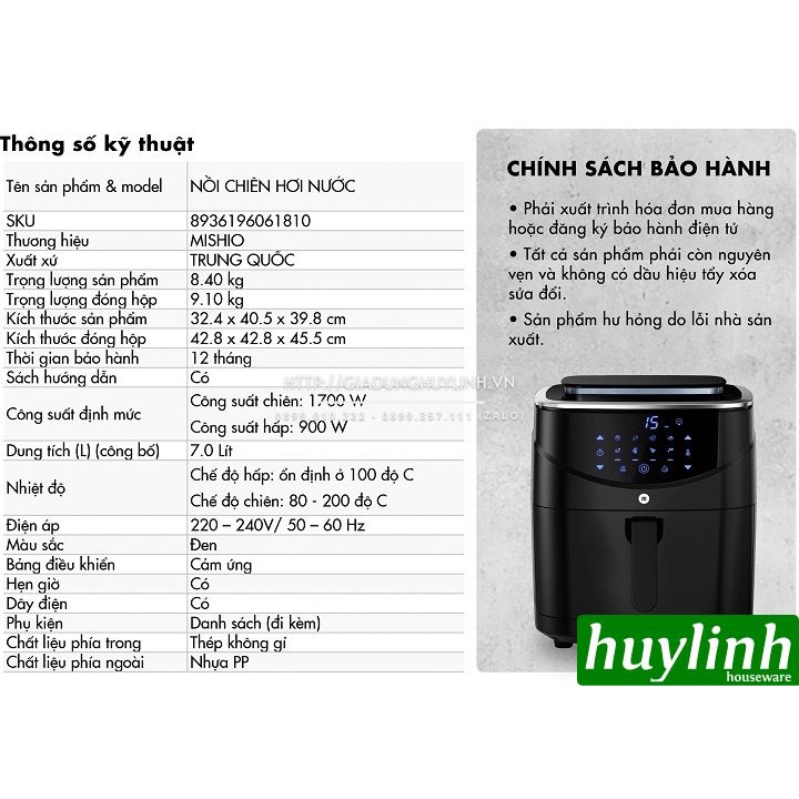 Nồi chiên không dầu hấp hơi nước Mishio MK302 với dung tích tổng tới 7 lít cùng công nghệ chiên và hấp trong 1 sản phẩm cùng công suất chiên 1700W, hấp 900W với bảng điều khiển cảm ứng hiện đại cao cấp.Huy Linh phân phối và bảo hành chính hãng tại Mishio Việt Nam