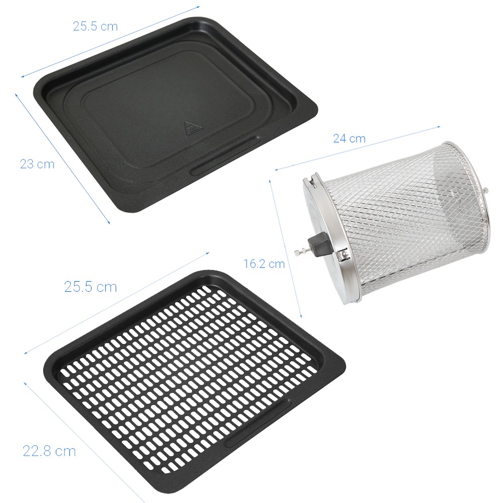 Bao gồm 2 khay lưới chân không, 1 thanh xiên Roti , 1 khay hứng mỡ, 1 tay cầm tháo Roti, 1 giỏ lưới xoay tròn để người dùng sử dụng dễ dàng thay thế trong quá trình chế biến thực phẩm.