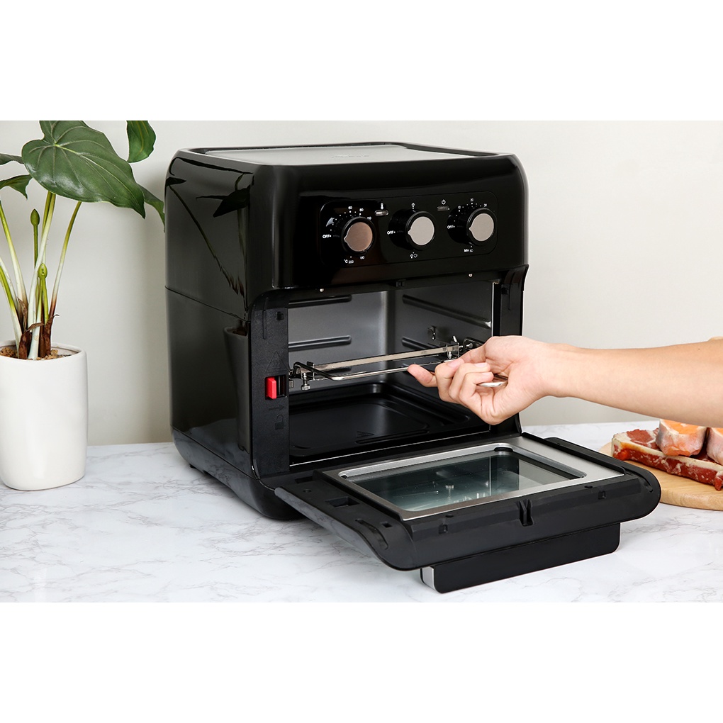 Thiết kế hình chữ nhật đứng, khay nướng ngang đưa thực phẩm ra vào dễ dàng hơn các máy dạng bầu tròn. Vỏ ngoài được làm bằng nhựa ABS cao cấp, cách nhiệt và chịu lực tốt.
