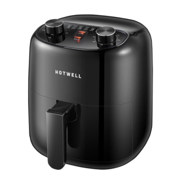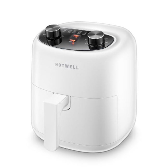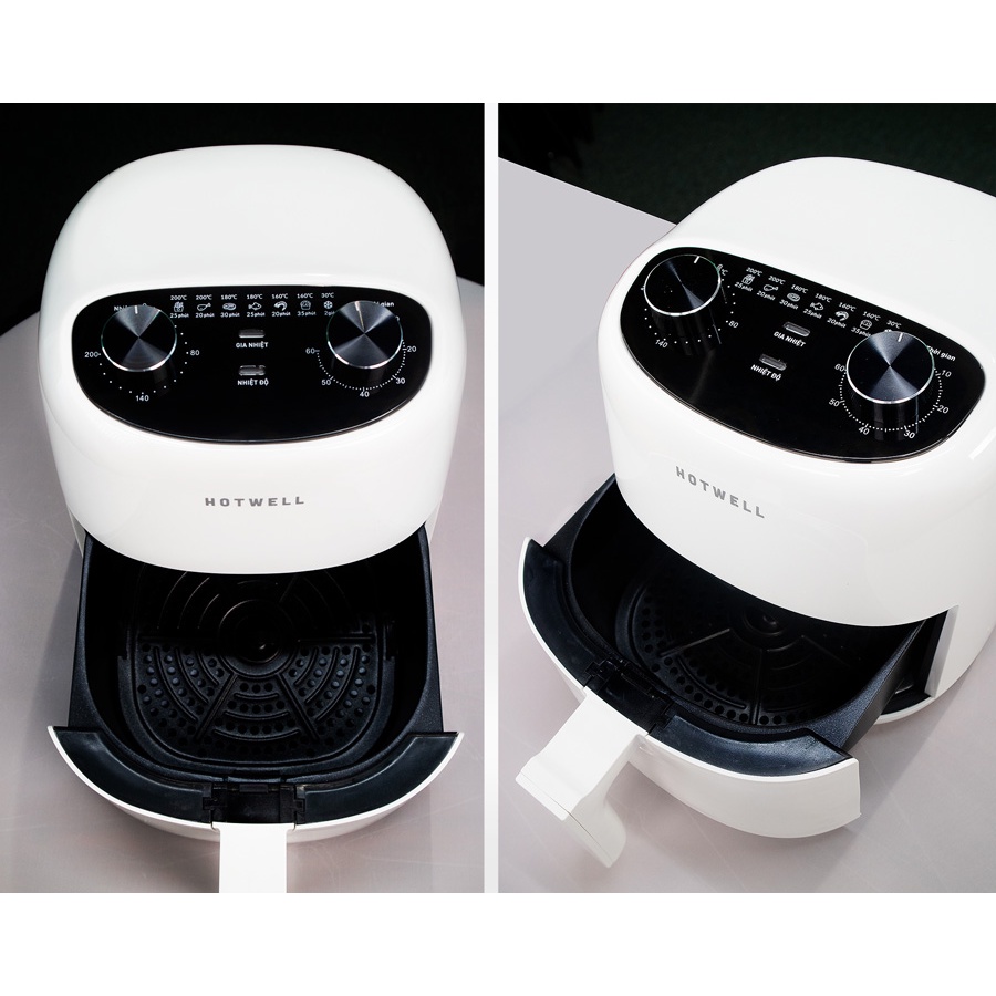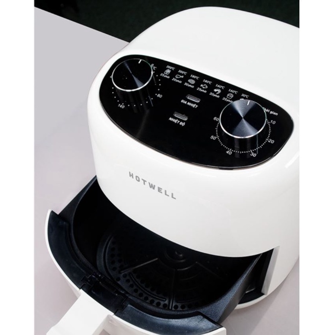 Nồi chiên không dầu Hotwell với kiểu dáng bo viền độc đáo, thiết kế với 2 núm điều khiển cơ bên trên rất tiện lợi. Vỏ làm bằng nhựa nguyên sinh an toàn cho sức khỏe.