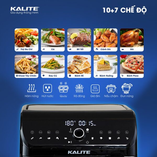 – Dung tích siêu khủng 12L, nồi chiên Kalite giúp bạn có thể tha hồ nướng gà nguyên con, nướng tới 20 cánh gà cùng lúc, pizza với đường kính 20 cm và hơn 800g khoai tây,…