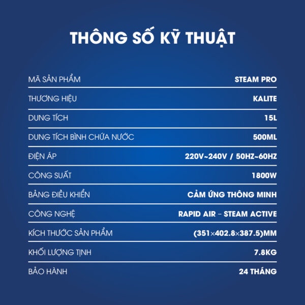 MÔ TẢ SẢN PHẨMTên sản phẩm: Nồi chiên hơi nước Kalite Steam Pro, công suất 1800w, dung tích 15L, công nghệ chiên hấp 2in1 là dòng nồi chiên hơi nước thế hệ mới, kết hợp chiên không dầu và hấp phun sương, chiên hơi nước hiện đại.