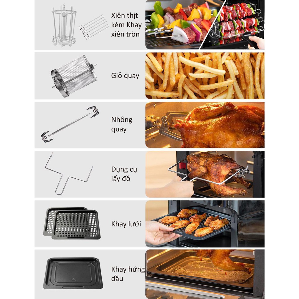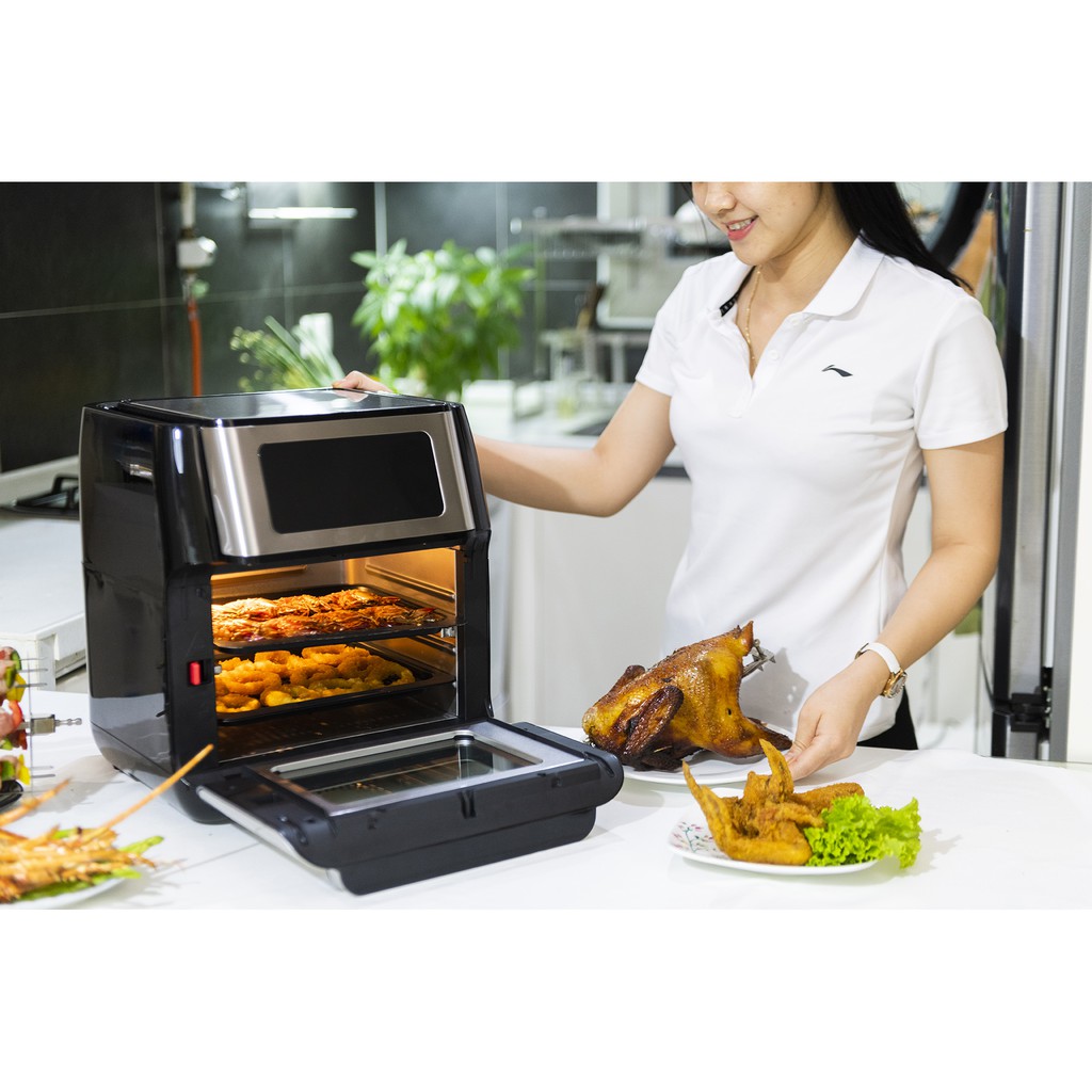– Chiếc nồi chiên có thể giúp tiết kiệm tiền và không gian khi thay thế 9 loại thiết bị bếp khác nhau như lò nướng , nồi chiên , máy nướng Pizza, máy nướng bánh mì, máy làm bỏng, máy ủ sửa, máy sấy hoa quả, nồi chiên sâu, lò vi sóng...)