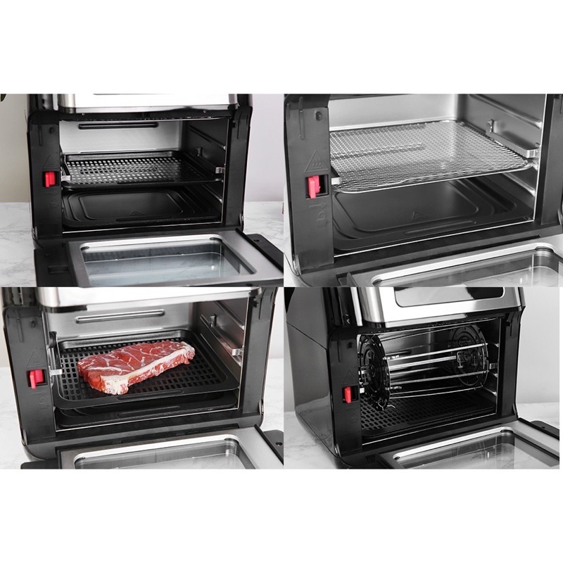 1. Thiết kế tinh tế với màn hình cảm ứng LCD với 10 chức năng hoàn hảo: Khoai tây chiên, nướng gà, nướng bò, nướng bánh, nướng tôm, sấy hoa quả, nướng xiên quay, đảo nhiệt đối lưu, nướng cá.
