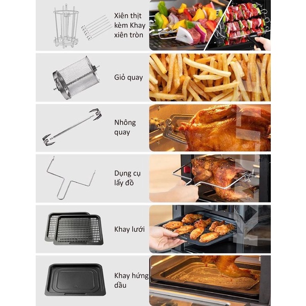 ✅ Thiết kế tinh tế với màn hình cảm ứng LCD với 10 chức năng hoàn hảo: Khoai tây chiên, nương gà, nướng bò, nướng bánh, nướng tôm, sấy hoa quả, nướng xiên quay, đảo nhiệt đối lưu, nướng cá.