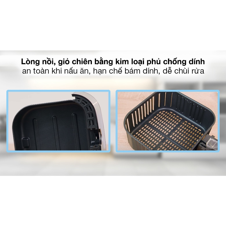 Dung tích 5.5L thuộc cỡ lớn so với các dòng nồi chiên thông thường trên thị trường không cần lo ngại lượng thực phẩm không đủ cho nhiều người. Khoang chiên được thiết kế hình vuông tạo khoảng không gian rộng rãi, tiện lợi để chiên được nhiều loại thực phẩm khác nhau như: khoai tây chiên, đùi gà hoặc tất cả các loại thực phẩm, phù hợp cho gia đình 4 – 6 người.