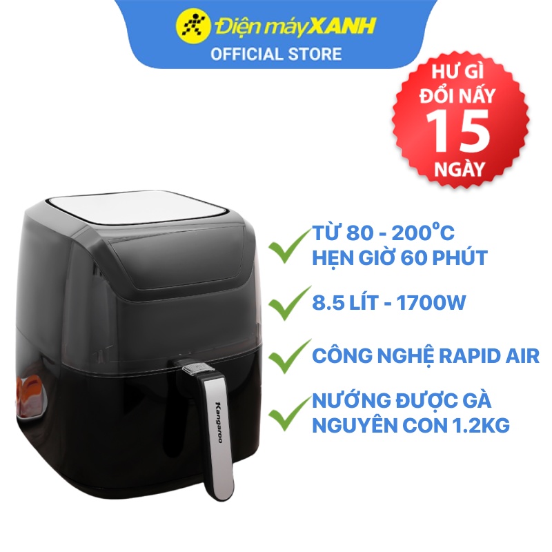 Nồi chiên không dầu Kangaroo KG8AF1A 5.5 lít với công suất 1700W, công nghệ làm nóng Rapid Air giúp chiên nướng hạn chế dầu mỡ, bảng điều khiển cảm ứng hiện đại,... là thiết bị gia dụng hữu ích đem đến các bữa ăn bổ dưỡng cho gia đình.•Dung tích sử dụng - Công suất