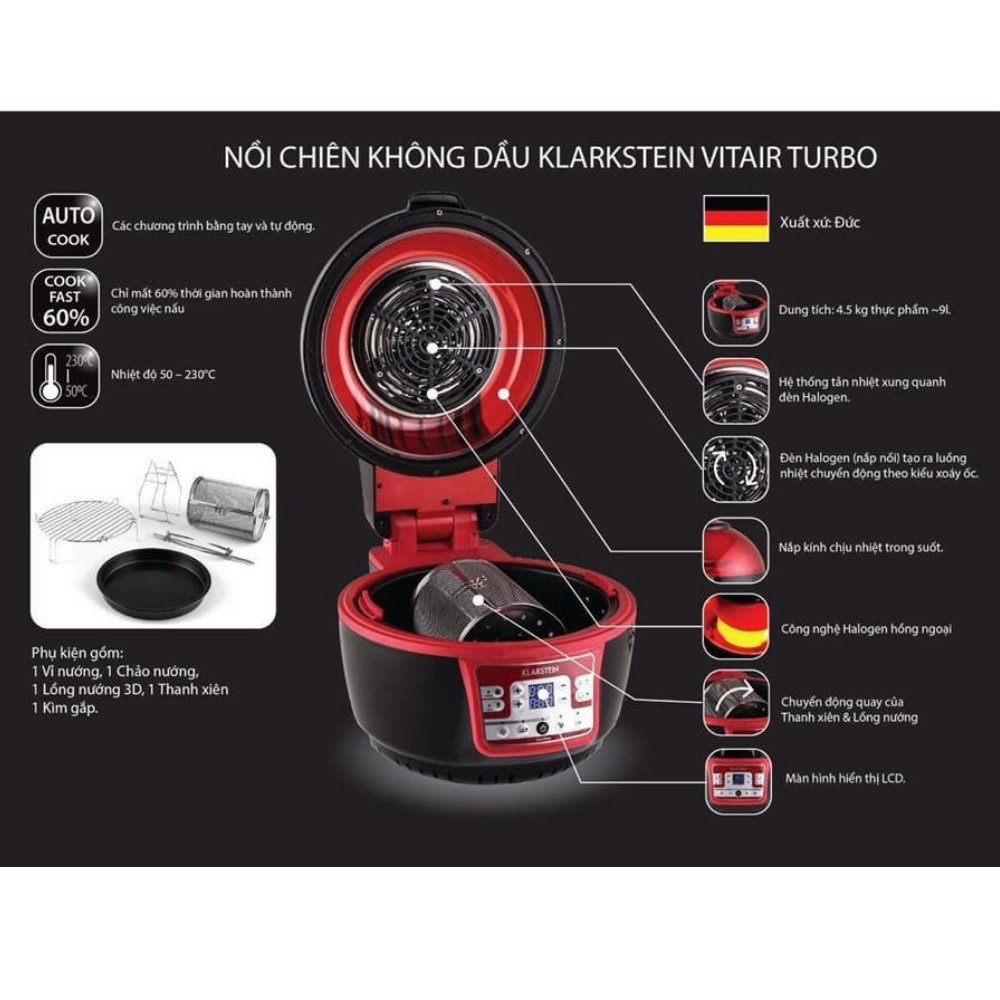 Nồi chiên không dầu KLARSTEIN TURBOR 9L - 2 màu Đỏ Đen [Hàng Đức Chính hãng]THÔNG TIN CHI TIẾT