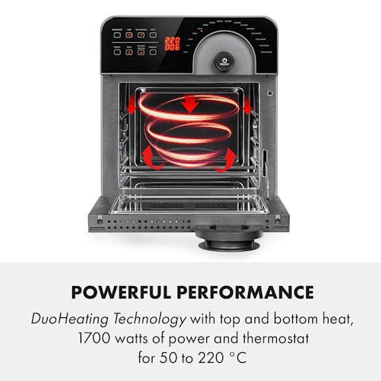 - Việc vận hành, sử dụng nồi nướng không dầu cũng vô cùng đơn giản với 16 chương trình với nhiệt độ và thời gian được cài sẵn của nồi chiên không dầu Klarstein Aero Vital Cube 14l. Tất nhiên, bạn vẫn có thể cài đặt thủ công nhiệt độ và thời gian theo ý của mình.