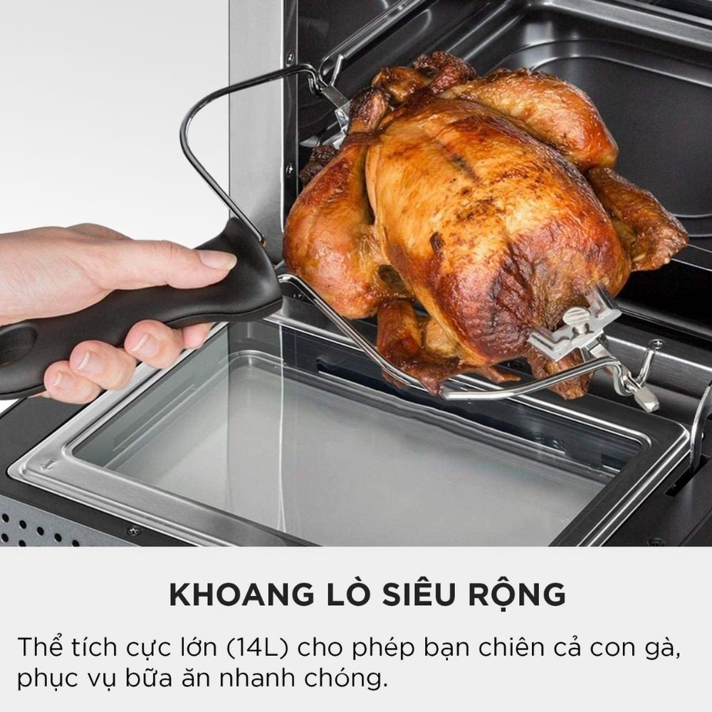 - Thiết kế hiện đại, nhỏ gọn, tiện lợi với công suất mạnh mẽ, dung tích đến 14 lít, khoang nồi thoải mái để chiên, nướng, quay nhiều loại thực phẩm; cùng nhiều chức năng, chế độ cài sẵn – việc nấu nướng sẽ trở nên dễ dàng hơn bao giờ hết.