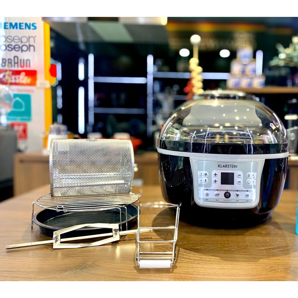 - Nồi chiên không dầu Klarstein được trang bị thêm đèn halogen gắn trên nắp, tạo ra khí nóng Turbo gấp đôi nhiệt giúp thực phẩm chín đều mà không bị khô.