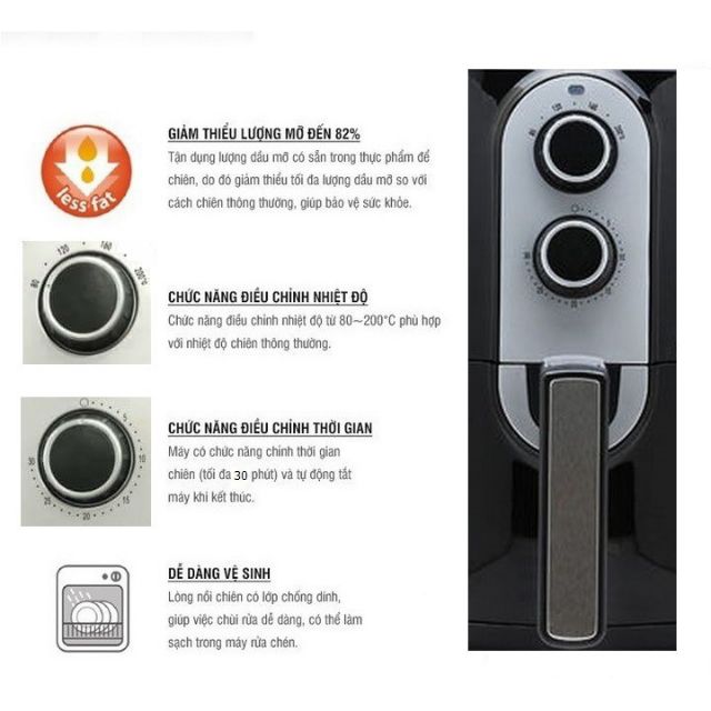 Chức năng hẹn giờ tích hợp cho phép bạn đặt sẵn thời gian nấu lên đến 30 phút. Điều khiển nhiệt độ có thể điều chỉnh cho phép bạn đặt trước nhiệt độ nấu phù hợp với thức ăn lên đến 200 độ C. Sản phẩm có ngăn kéo phủ lớp chống dính có thể tháo rời và giỏ thức ăn có thể rửa được bằng máy rửa chén, giúp việc vệ sinh máy trở nên dễ dàng