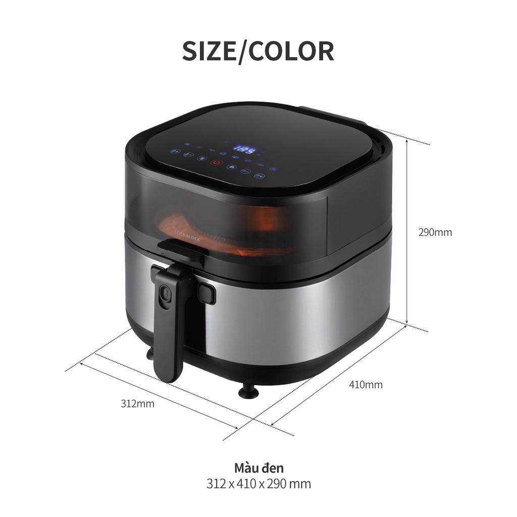 Nồi chiên không dầu Lock&Lock Visible Stirring Air Fryer 7.2L - màu đen EJF596BLK bảo hành 12 tháng chính hãng- Kích thước: 321x410x290mm