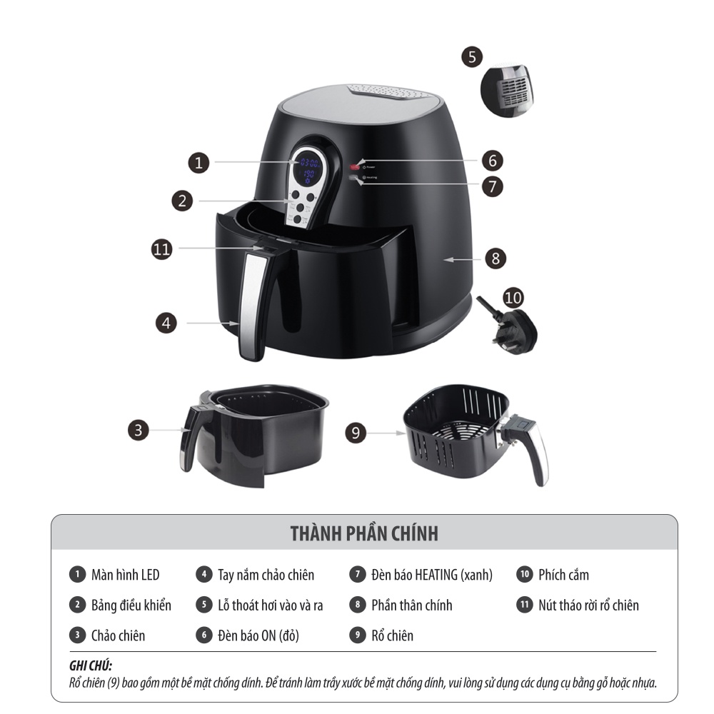 - Chức năng điều chỉnh nhiệt độ từ 60~200 độ C, phù hợp với nhiệt độ chiên thông thường.