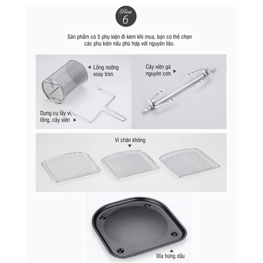 Công nghệ làm chín thực phẩm hiện đại: Sản phẩm làm chín thực phẩm bằng các luồng khí nóng thay vì dầu nóng, giúp bạn chế biến món ăn lành mạnh hơn. Sản phẩm còn được trang bị bộ lọc mùi và khói. Là sự tổng hợp của nhiều thiết bị và dụng cụ nấu nướng, với bộ hẹn giờ kỹ thuật số được tích hợp chế độ tự động tắt.