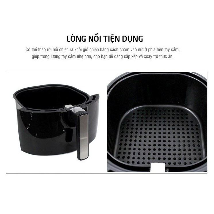 Dung tích nồi chiên 5.2L lít phù hợp để bạn chiên thực phẩm ăn trong ngày cho gia đình khoảng 6-8 thành viên. Với dung tích này, bạn có thể chế biến các món như: Cánh gà chiên, đùi gà chiên, khoai tây/ khoai lang chiên,... hoặc chiên nguyên cả con gà luôn ạ!