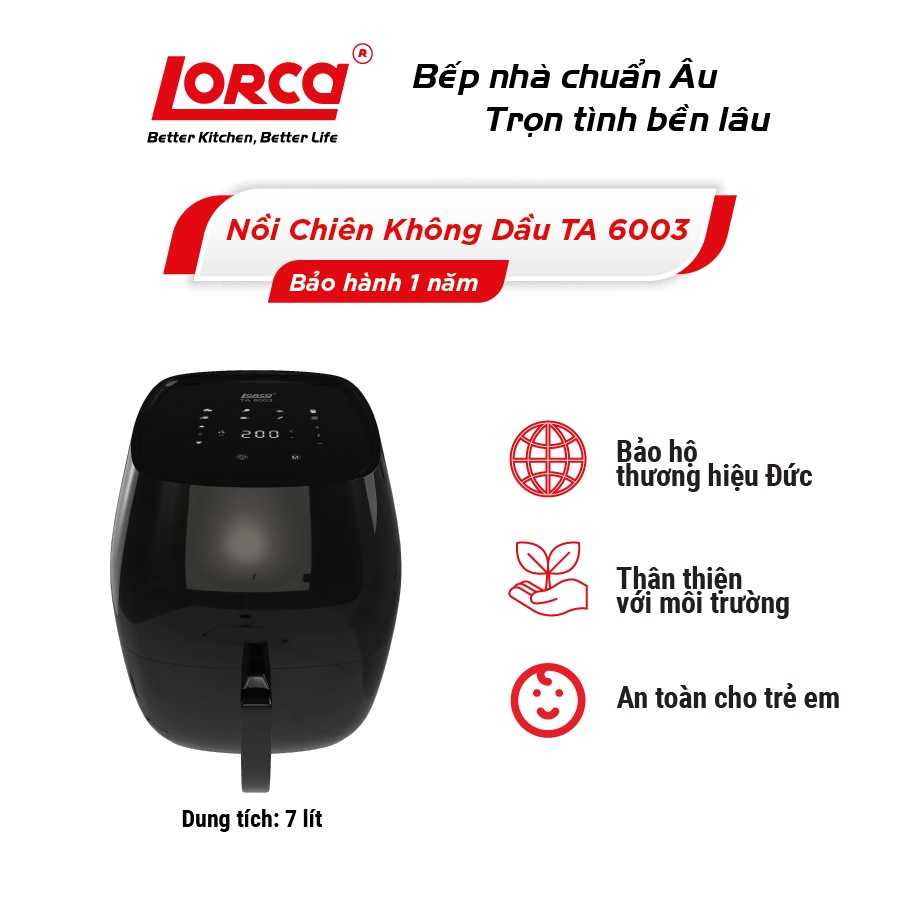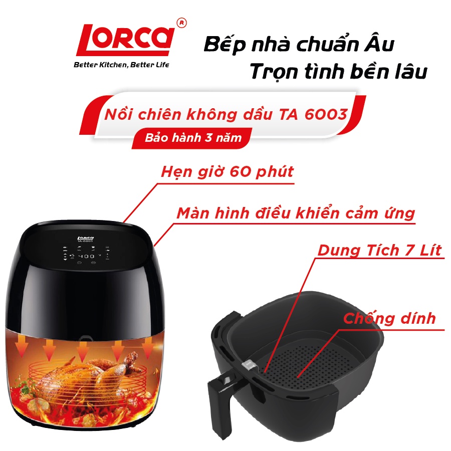 📘 Mô tả sản phẩm: Nồi chiên không dầu Lorca TA 6003 dung tích 7 lít bảo hành 1 năm