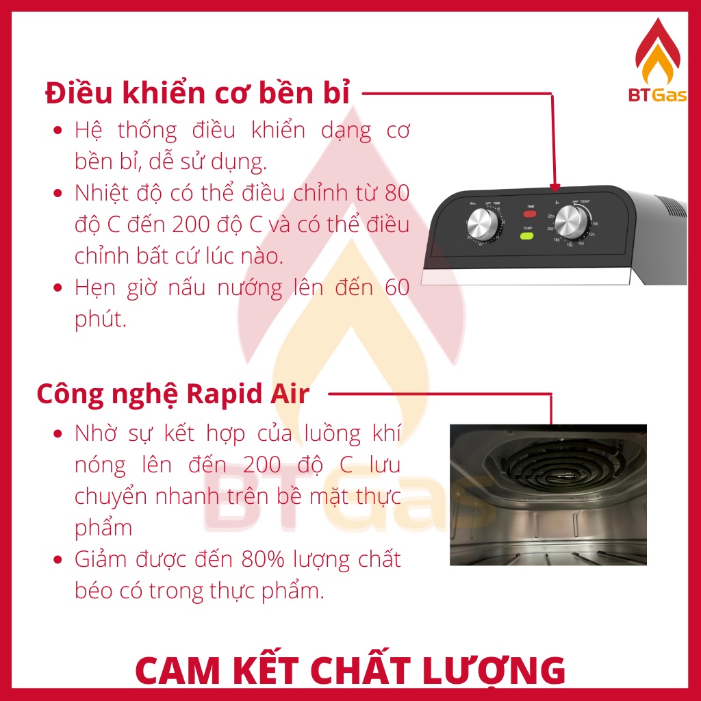✔️ Công nghệ Rapid Air sử dụng trong nồi chiên không dầu Lorente LT-1600 mô phỏng hiệu ứng của nồi chiên sâu, sử dụng không khí là chất mang nhiệt thay vì dầu mỡ, đây là công nghệ đốt nóng chân không với khí nóng lên đến 200 độ được thổi bằng quạt gió mạnh (300W) giúp thực phẩm chính nhanh và chín đều tất cả các bề mặt.