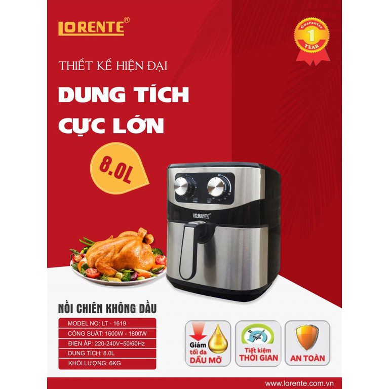 Giới thiệu NỒI CHIÊN KHÔNG DẦU ⚡ LORENTE CHÍNH HÃNG 8 LÍT LT-1619