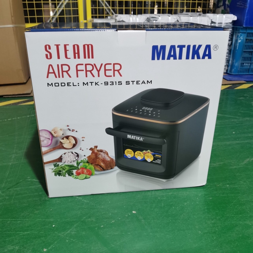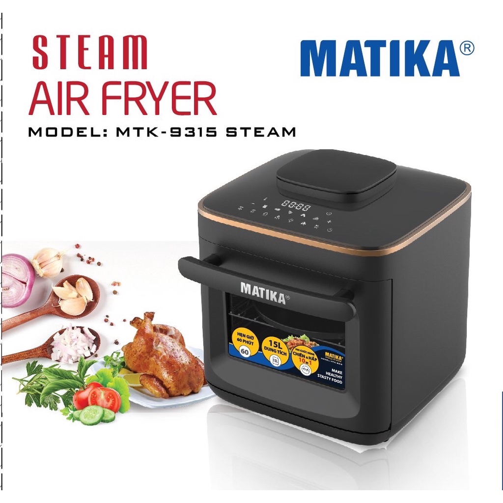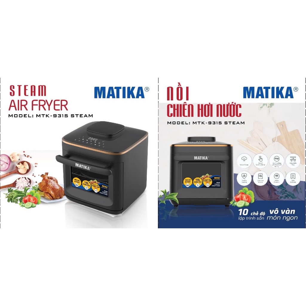 Nồi chiên hơi nước 💖 MATIKA 💖 15l vừa chiên vừa hấp MTK-9315Nồi chiên hơi nước chính hãng Matika MTK-9315 dung tích 15L sở hữu thiết kế sang trọng giúp nâng tầm không gian bếp gia đình, công nghệ 2 trong 1 với sự kết hợp giữa công nghệ chiên hơi nước Steam Active đối lưu và công nghệ chiên không dầu Rapid Air cho món ăn thơm ngon trọn vị dưỡng chất.