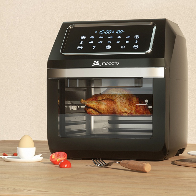 - PHỤ KIỆN ĐẦY ĐỦ LỒNG RANG VÀ XIÊN NƯỚNG: Nồi chiên không khí Mocato được trang bị trục xoay, phục vụ tốt cho những người có nhiều nhu cầu về nướng hoặc rang.
