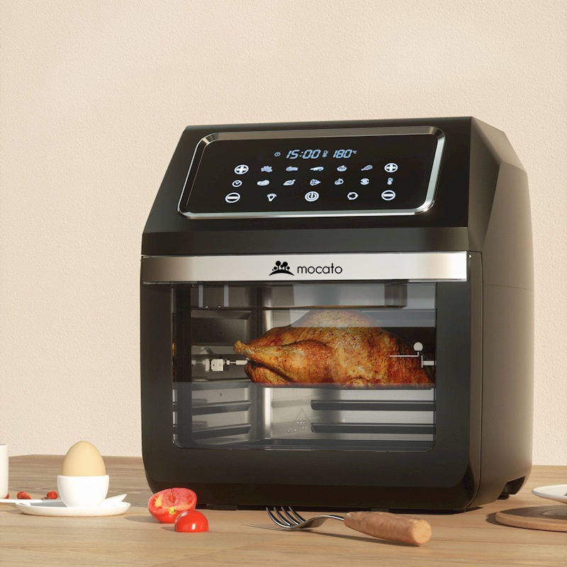 - PHỤ KIỆN ĐẦY ĐỦ LỒNG RANG VÀ XIÊN NƯỚNG: Nồi chiên không khí Mocato được trang bị trục xoay, phục vụ tốt cho những người có nhiều nhu cầu về nướng hoặc rang.