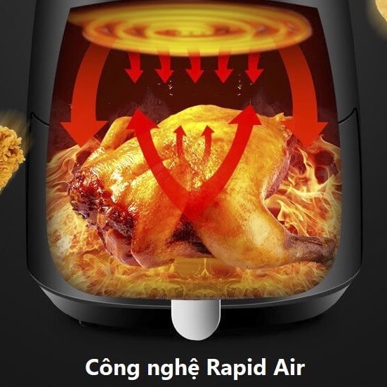 - Nồi chiên không dầu Nine Shield 8L sử dụng công nghệ đốt nóng chân không Rapid air từ bóng đèn Halogen không sản sinh khói, giảm mùi trong thực phẩm, sử dụng tối đa luồng không khí nóng để chiên, nướng thức ăn, giúp thức ăn chín nhanh mà không bị khô, vẫn giữ lượng nước và mùi vị của thức ăn ( Nồi chiên thường dùng dây mai so không đảm bảo an toàn sức khỏe).