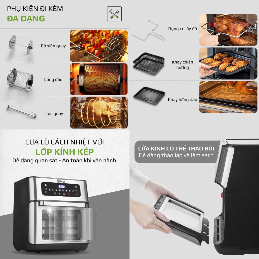 Giới thiệu Nồi chiên không dầu Olivo AF12, bếp chiên không dầu 12L, nồi chiên gà nguyên con có trục xoay, chính hãng Unie
