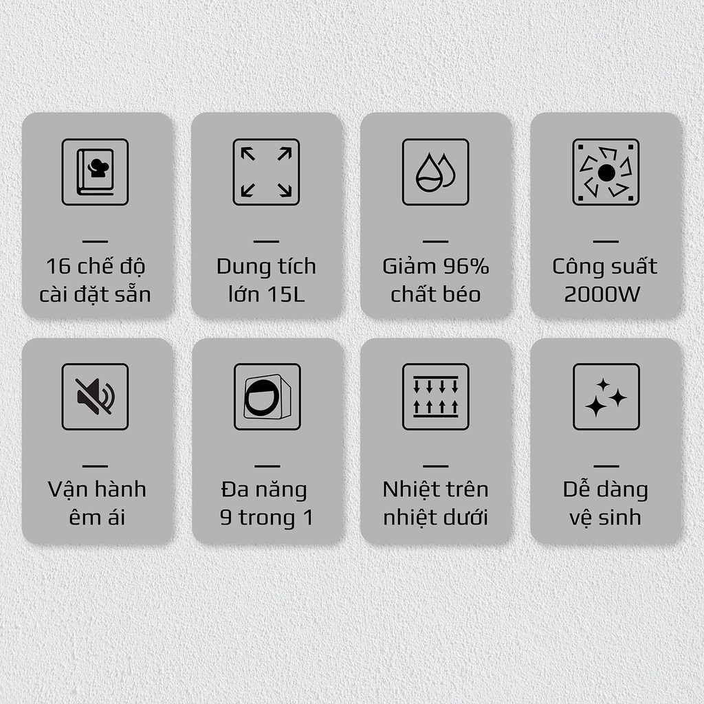 Với 16 chế độ riêng biệt cho các loại thực phẩm như thịt gia súc, thịt gia cầm, các loại củ, trái cây hoa quả, các loại bánh, làm sữa chua...bạn chế biến thực phẩm được ngon hơn, giòn hơn, nhanh hơn một cách tuyệt đối. Việc nội trợ bếp núc không còn là một cuộc chiến mà hoàn toàn đơn giản và tự động, trong lúc nấu ăn cùng nồi chiên không dầu Olivo AF15, bạn hoàn toàn có thể thảnh thơi thư giãn xem phim, đọc báo, nghe nhạc mà không lo món ăn bị hỏng như bị sống, hoặc bị cháy.