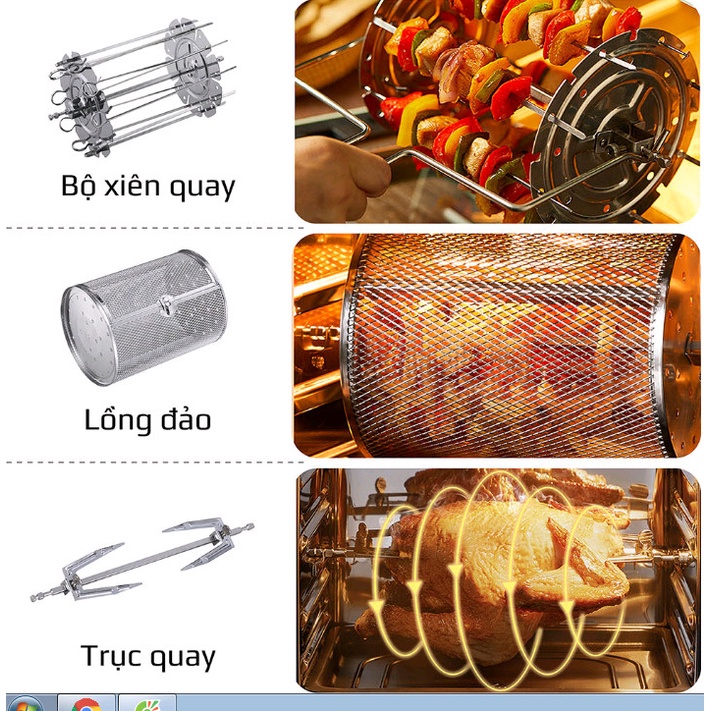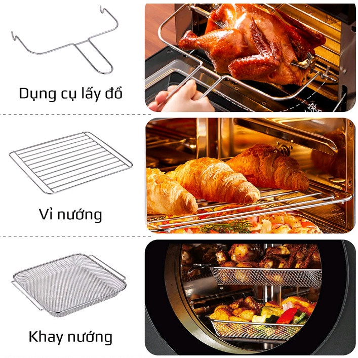 Bộ phụ kiện gồm 8 dụng cụ: khay hứng dầu, lồng kẹp, giá treo dây, rổ lưới, khay lưới trục xiên... hỗ trợ nấu nướng tối đa.