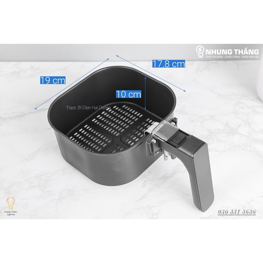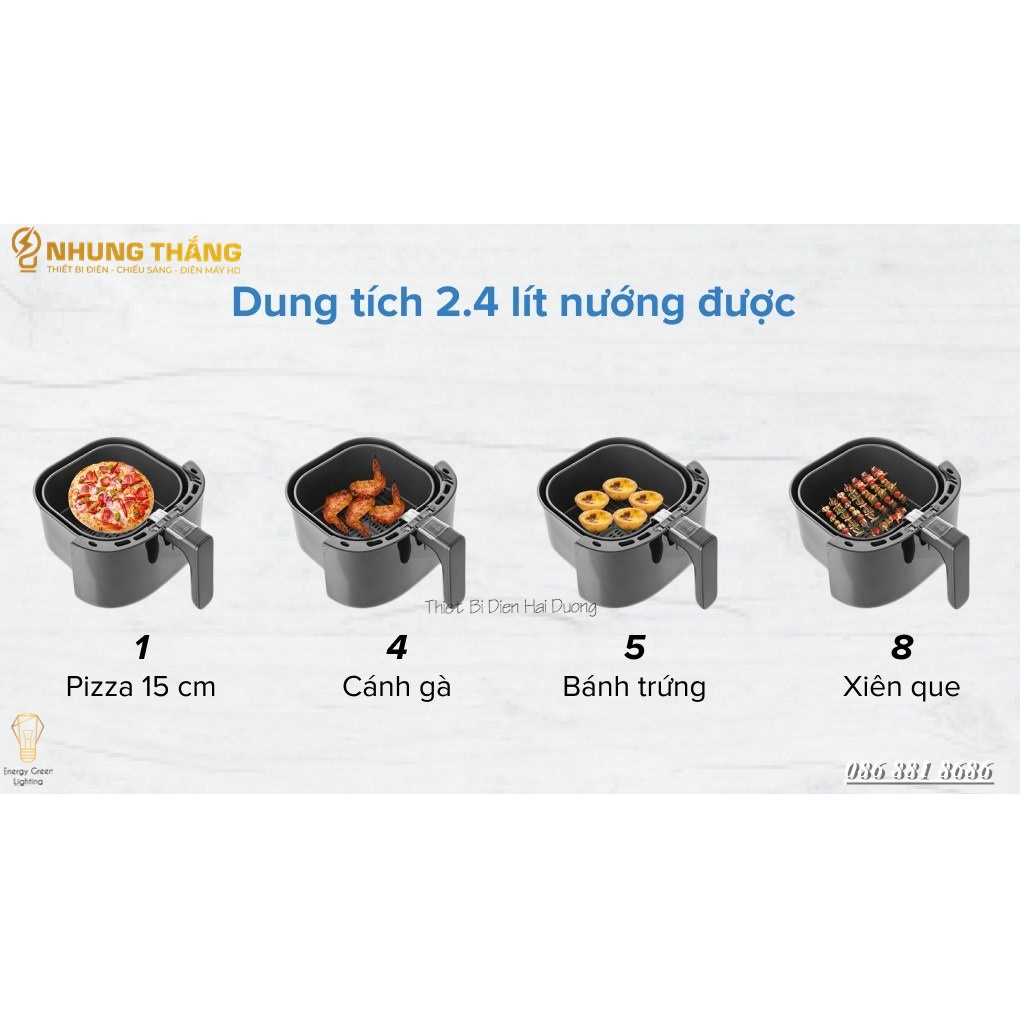 - Nồi chiên không dầu với khay chứa thực phẩm dung tích 2.4 lít, chiên nướng khoảng 0.8 kg thức ăn