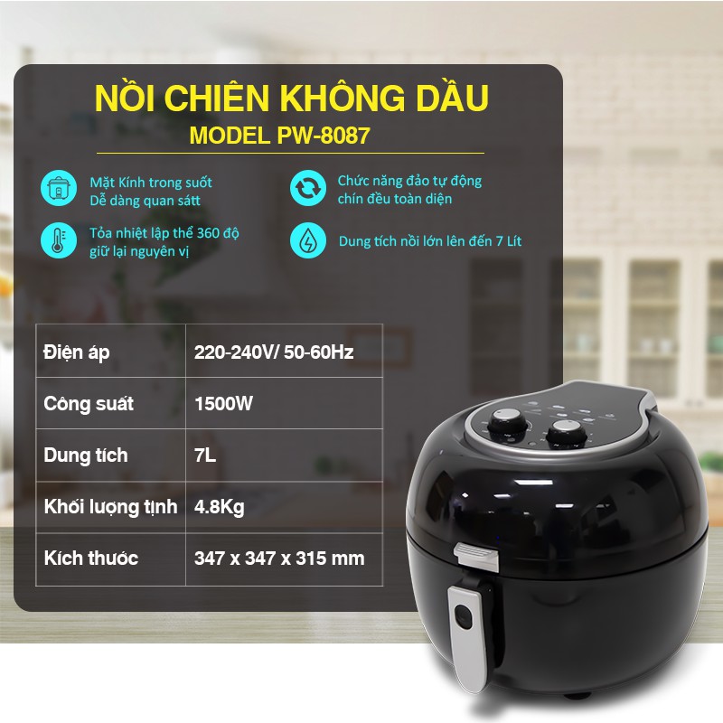 Thiết Bị Điện Gia Dụng > Đồ gia dụng nhà bếp > Nồi chiên ngập dầu || [Mã ELHADEV giảm 4% đơn 300K] Nồi Chiên Không Dầu PW-8087D 7L Điều Khiển Cơ 1500W - Bảo Hành 12 ThángCòn hàng