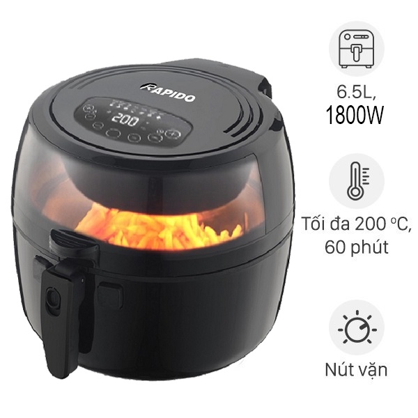 Thiết Bị Điện Gia Dụng > Đồ gia dụng nhà bếp > Nồi chiên không dầu || Nồi chiên không dầu RAPIDO RAF6.5M dung tích 6.5L công suất 1800W giúp bạn tiết kiệm công sức và thời gian nấu nướngCòn hàng