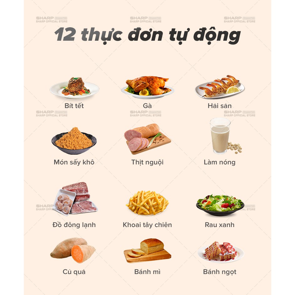 12 thực đơn tự động: Bít tết, Gà, Hải sản, Món sấy khô, Thịt nguội, Làm nóng, Đồ đông lạnh, Khoai tây chiên, Rau xanh, Củ quả, Bánh mì, Bánh ngọt