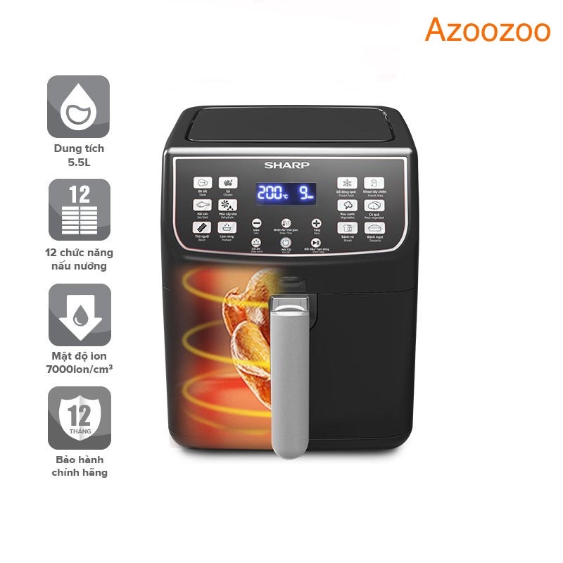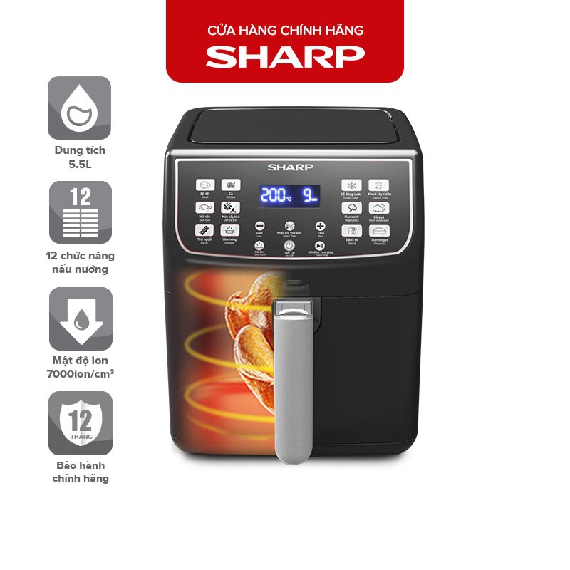Nồi Chiên Không Dầu Sharp KF-AF55EV-BK [NEW 2021] Chống Dính 5.5L [Màn Hình LED, Công Suất: 1550-1850W, Công Nghệ Làm Nóng: Rapid hot air, 12 Công Thức Thực Đơn Tự Động] - Bảo Hành Chính Hãng 12 ThángDung tích: Rổ chiên: 5.2 L / Nồi chiên: 5.5 L