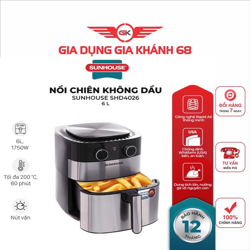 Giới thiệu Nồi chiên không dầu SUNHOUSE SHD4026 6L - Công suất 1750W- Hàng Chính Hãng- Bảo Hành 12T