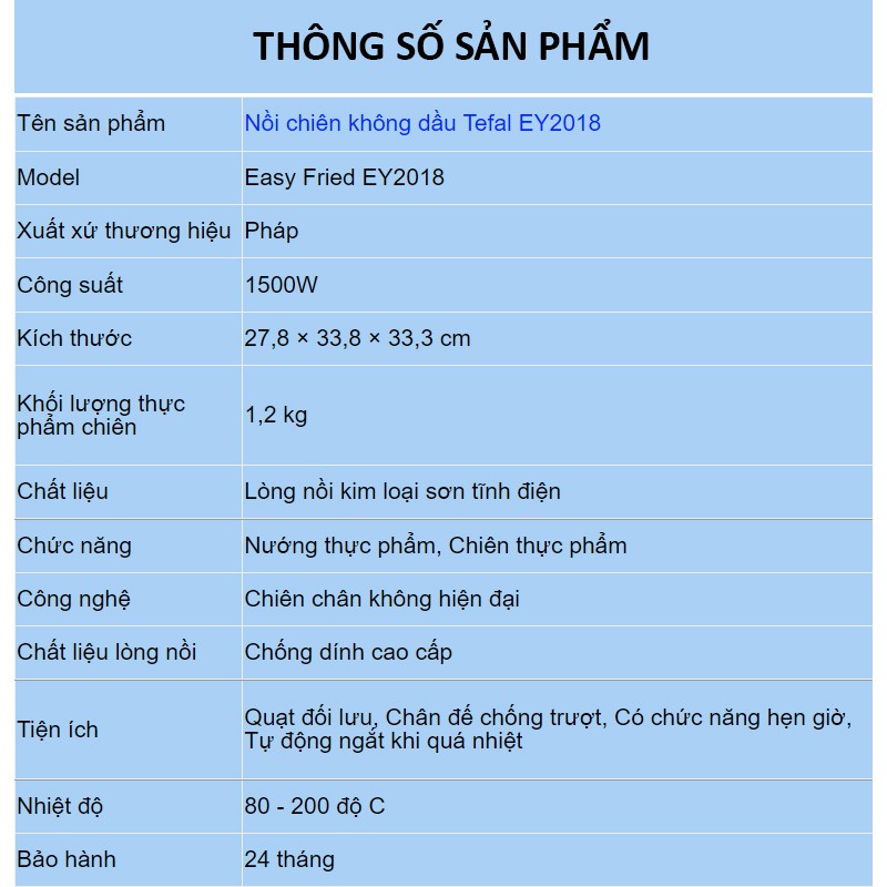Nồi chiên không dầu Tefal EY2018 là thương hiệu danh tiếng số 1 về hàng gia dụng tại Pháp, nhưng không chỉ tại Pháp, Tefal còn là hãng gia dụng uy tín ở hầu hết các nước phát triển trên toàn thế giới như Đức, Mỹ, Canada, Nhật, Hàn…THÔNG SỐ SẢN PHẨM: