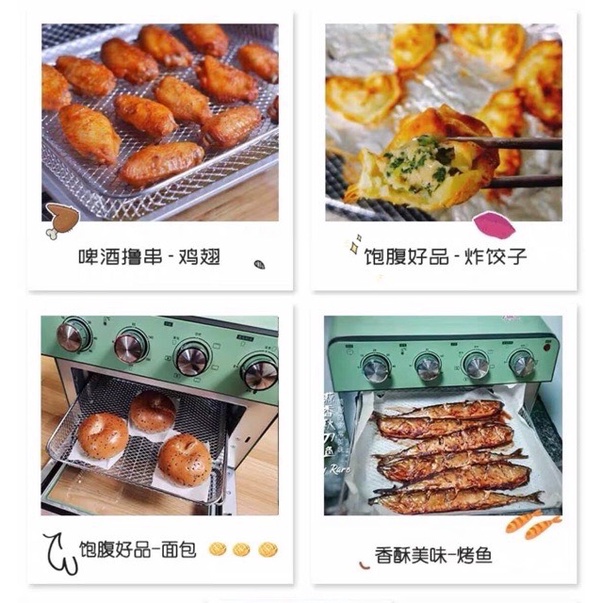 Phụ kiện đi kèm: Lò nướng * 1, khay nướng * 1, lưới nướng * 1, giỏ nướng * 1