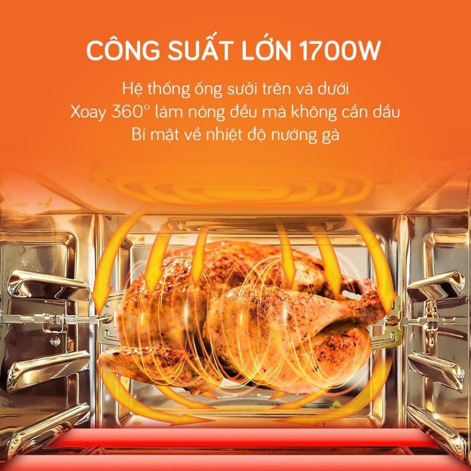 - Phụ kiện đa dạng bao gồm: xiên quay, giỏ/lồng quay, nhông quay, dụng cụ lấy đồ, vỉ nướng chống dính, khay hứng dầu ăn, tấm lưới chắn dầu