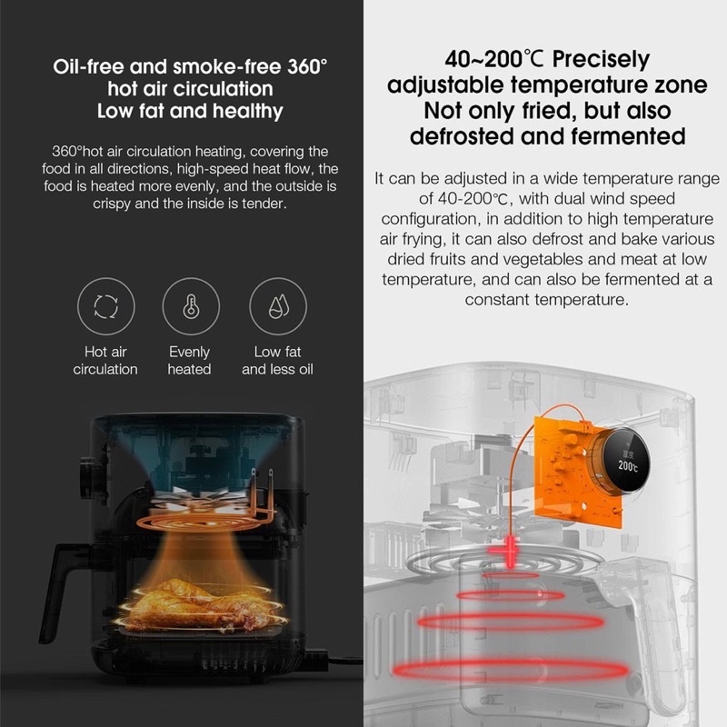 Nồi chiên không dầu Mijia 3.5L được nhà sản xuất giới thiệu là có thể tích hợp các tính năng khác như làm sữa chua, sấy khô hoa quả, lò vi sóng, lò nướng điện... Để làm được điều này, nồi chiên không khí Mijia có phạm vi điều chỉnh nhiệt khá rộng từ 40 đến 200°C, không chỉ chiên mà còn có thể rã đông và lên men.