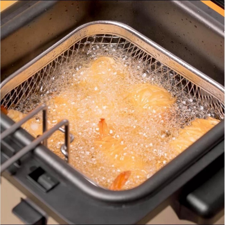 - Bạn có thể nâng giỏ chiên lên và làm ráo dầu nhờ vào móc tích hợp trong khi mở nắp.