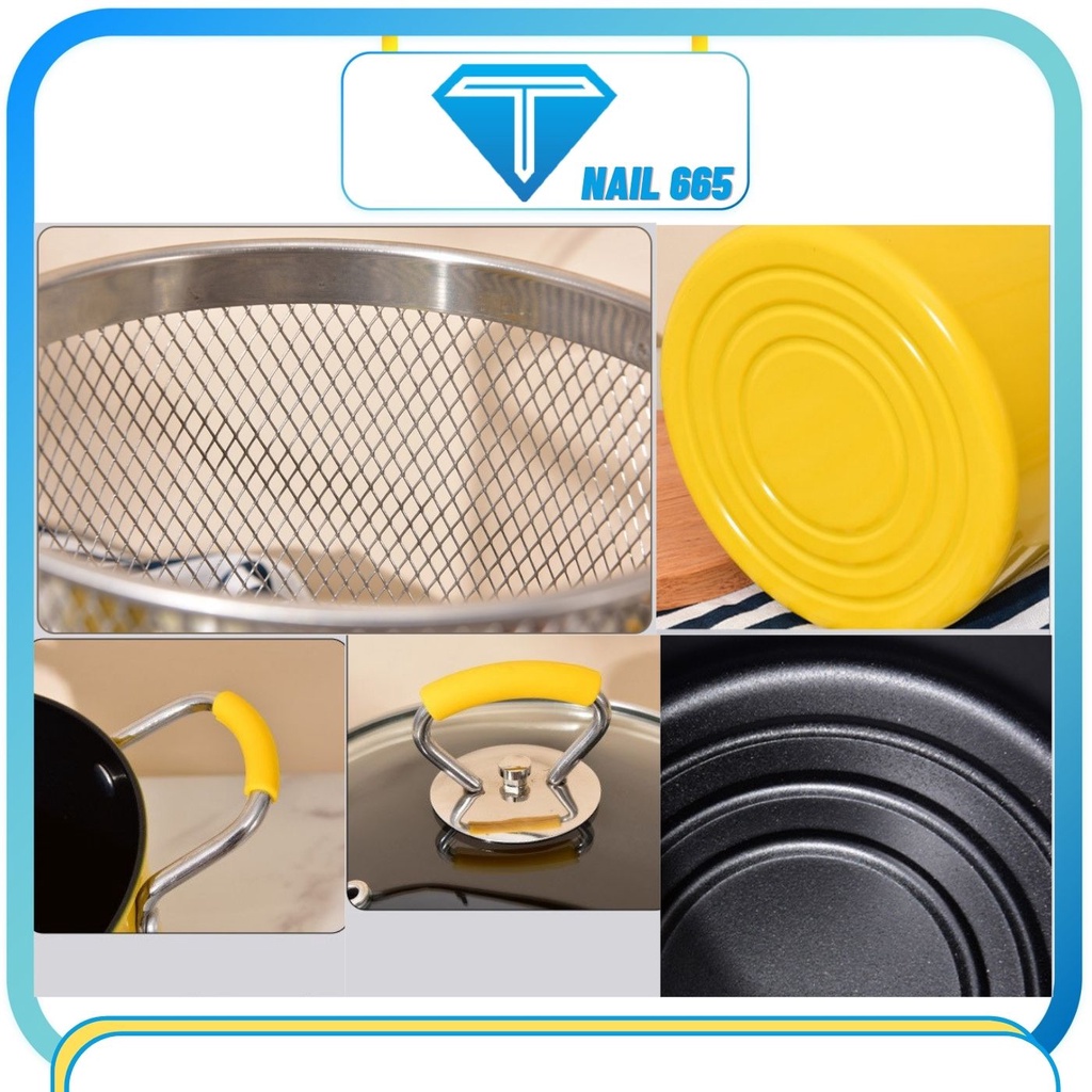 * Mô tả : Nồi chiên ngập dầu sâu lòng mini có nắp đậy ,chống dính kèm 1 giỏ lưới đa năng